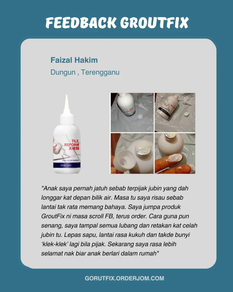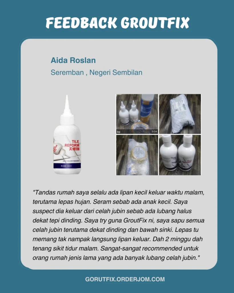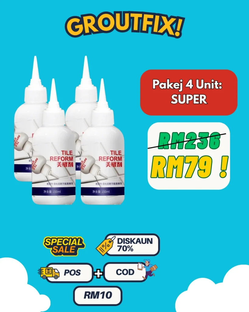 4. Tahan Lama & Berkualiti→ Grout kalis air & tahan kulat. Kekal putih dan tidak mudah mengelupas walau selepas bertahun digunakan.